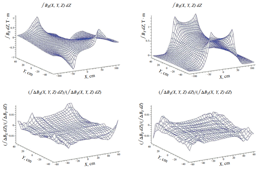 Некоторые иллюстрации к сравнению расчетов и измерений представлены на рис. 9 в терминах интегралов поля вдоль оси Z. Показаны только две поперечные компоненты, которые вносят доминирующий вклад в отклонение в магните заряженных частиц, летящих под малыми углами к оси Z. По среднеквадратичным отклонениям от нуля для всей показанной XY-плоскости имеет место согласие в пределах ±0.3% для интеграла от BX и в пределах ±0.18% – от BY. Вдали же от полюсов при |Y| < 30 см согласие лучше: около ±0.14% для обеих компонент.