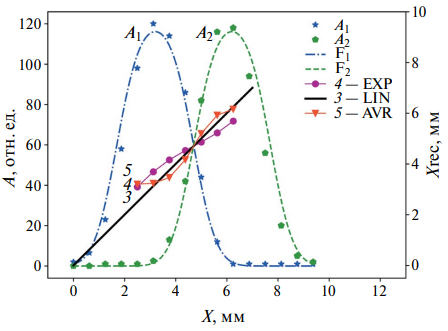 где Ai, Xci – амплитуда и координата центра фотоэлемента. В частном случае, когда амплитуды равны (А1 = А2), реконструированная координата по методу центра тяжести равна Xs = 0.5 (Xc1 + Xc2) и определяет координату положения между фотоэлементами. В процедуре EXP [11] используется предположение, что распределение интенсивности в световом пучке имеет форму Гаусса и формула для восстановления координаты имеет вид Xrec = Xs + b ln(A2/A1), где параметр b связан с шириной распределения Гаусса (σ) следующим образом b ∼ 0.5σ. На рис. 2 для сравнения качества алгоритмов (AVR, EXP) приводится прямая линия (LIN), уравнение которой выглядит следующим образом: Xrec = X.