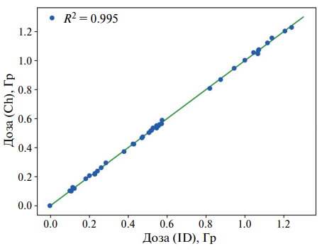 Отклонение этой зависимости от прямой линии характеризуется коэффициентом детерминации R2 = 0.998, что подтверждает пропорциональность показаний RF и ID.