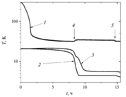 Рис. 2. Зависимость от времени (начиная с момента включения CR) температур первой ступени (1), стабилизатора (2) и ванны 3He (3). Стрелками 4 и 5 помечены моменты начала и окончания набора жидкого гелия гелия в стабилизатор. Начальная температура всех узлов комнатная. Показания термометров 2 и 3 соответствуют истинной температуре при ее значении ниже примерно 10 K.