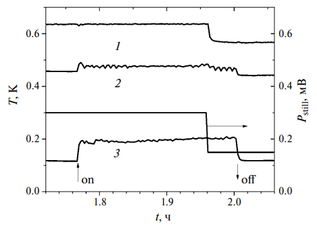 При достижении температуры ванны 3He уровня 1–1.2К выключается нагрев сорбера и в его рубашку подается теплообменный газ. Ванна 3He, испаритель и миксер остывают до температуры 0.4–0.6 К. Включается нагрев испарителя мощностью 0.3–0.5мВт и активируются циркуляция 3He в контуре растворения, приводящая к охлаждению миксера и находящегося с ним в тепловом контакте детектора. На этом этапе нагрузка на стабилизатор падает до уровня порядка 1мВт. Это позволяет выключить CR и тем самым устранить вибрации. Эффект включения/выключения CR наглядно виден на рис. 3 – температура миксера скачком возрастает, а затем падает.