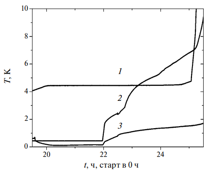 При выключенном CR рабочие условия поддерживаются благодаря испарению жидкого гелия, накопленного в стабилизаторе. Если ванна для жидкого азота пуста, то время, за которое гелий полностью испарится, составляет до 5 ч, рис. 4. Если же в нее залит жидкий азот, то это время достигает 8 ч. Тепловая связь азотной ванны с экраном, связанным с первой ступенью CR, осуществляется благодаря азоту, находящемуся при комнатной температуре в конвективном теплопроводе под давлением около 70 ати. Однако такой тепловой связи недостаточно, чтобы поддерживать температуру экрана на уровне температуры кипения жидкого азота, поскольку подвод тепла из комнаты к первой ступени намного эффективнее, чем от ванны с азотом. Связать же эту ванну непосредственно с экраном опасно. При рабочей температуре первой ступени около 40 K, если ванна не заполнена жидким азотом, в ней будет конденсироваться атмосферный кислород, что чревато непредсказуемыми последствиями. В нашем случае это исключено, так как пустая ванна не охлаждается до такого уровня.