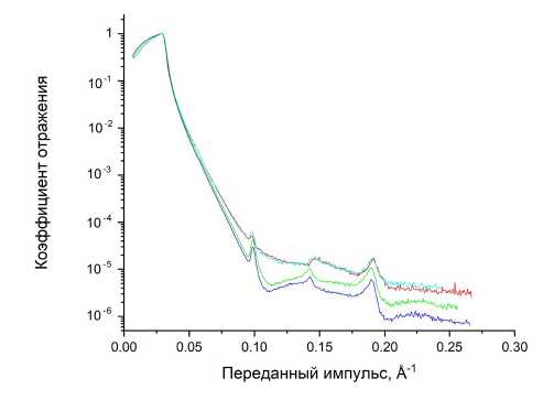 Однако, несмотря на разницу в ослаблении при Q > 0.005, кривые демонстрируют высокую степень подобия, одинаковую величину критического угла, а также обладают дифракционными пиками при одних и тех же Q, что говорит о подобии в структурной организации слоев образцов. Подгонка по методу наименьших квадратов показала, что пленка обладает плотностью 2.47 г/см3 и представляет собой сверхрешетку с характерными толщинами слоев 6.4 нм и 4.3 нм, пики от которых наблюдаются на рис. 1 в соответствии с условием Вульфа–Брэгга.