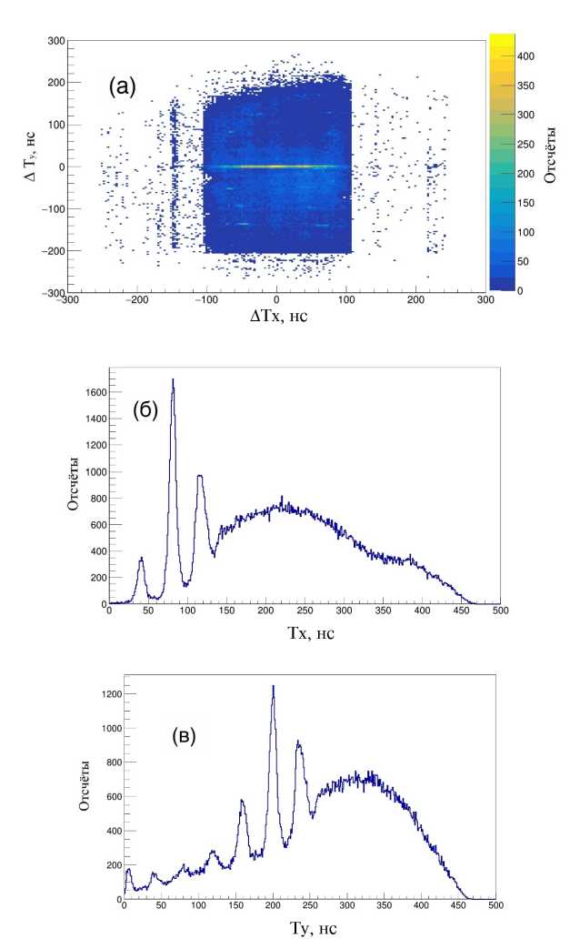 На рис. 5б и 5в представлены суммы времени прихода сигналов на оба конца линии задержки для x- и y-координат соответственно. Они содержат, помимо основного пика, соответствующего общей длительности линии задержки, побочные пики. Побочные пики возникают в сумме времени прихода сигнала из-за осциллирующей формы некоторых анодных сигналов (рис. 6а).
