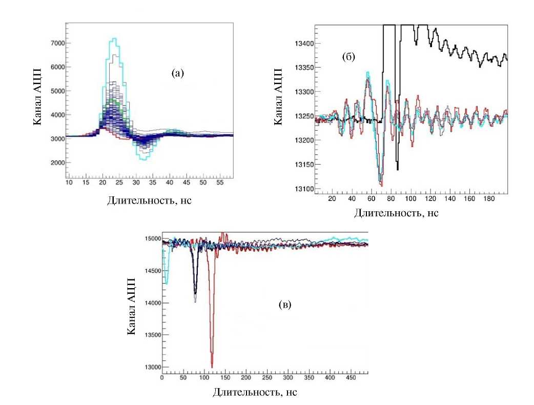 Рис. 6. Формы сигнала: а – нормальная форма анодного сигнала, б — осциллирующая форма анодного сигнала, в – расположение сигналов с линии задержки во временном окне, открываемом разными частями колебания осциллирующего анодного сигнала.