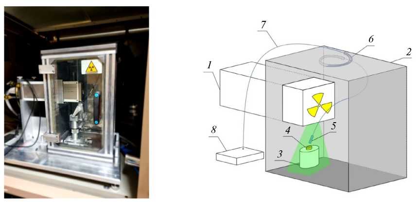 Рис. 1. Рентгеновский спектрометр (слева) и его схема (справа) ): 1 – рентгеновская трубка, 2 – рентгенозащитная камера, 3 – столик для образца, 4 – образец, 5 – конденсор, 6 – свинцовые каналы, 7 – световод, 8 – анализатор спектров.