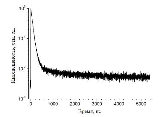 Для получения необходимой концентрации ионов Се3+ в кристаллах были приняты меры, позволившие получить концентрацию ионов Се3+ в предварительно синтезированной шихте YAG в диапазоне от 1 до 2.5 ат.% (замещения ионов Y). Из такой шихты были выращены кристаллы с концентрацией ионов Се3+ от 0.1 до 0.4 ат.%. Концентрация ионов Се3+ в кристаллах контролировалась по спектральной методике, рассмотренной в работе [21]. При концентрации ионов Се3+, равной 0.1 ат.%, были получены кристаллы с рабочей зоной размером 50×80×15 мм³ и неравномерностью распределения ионов Се3+ по длине заготовки, не превышающей 10%. При выращивании кристаллов YAG:(Се,Tb) с концентрацией Tb в диапазоне от 2 до 8 ат.% не возникали дополнительные трудности в связи с меньшим ионным радиусом и значительно более высоким коэффициентом распределения тербия в YAG, равным примерно 0.9 [22]. Дополнительно проведенные исследования показали, что световыход полученных методом Багдасарова в вакууме монокристаллов составляет 22 000−25 000 фот./МэВ (для образцов с концентрацией ионов Се3+, равной 0.1−0.4 ат.%). Пример кинетики затухания рентгенолюминесценции образца с концентрацией ионов Се3+, равной 0.4 ат.%, приведен на рис. 4.