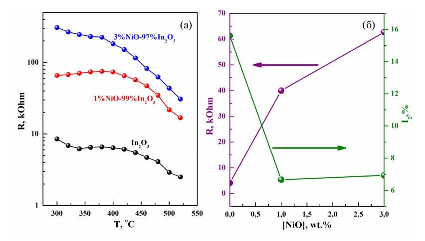 Композиты NiO–In₂O₃ обладают электронным типом проводимости. В температурном интервале от 300 до 520°С сопротивление композитов постепенно снижается с повышением температуры сенсорного слоя, что характерно для полупроводников n-типа (см. рис. 5a). При этом c увеличением содержания оксида никеля в композитах сопротивление сенсорного слоя растет (см. рис. 5б).