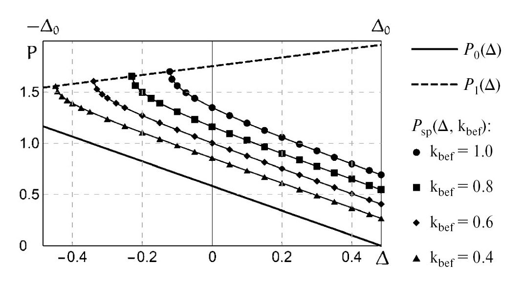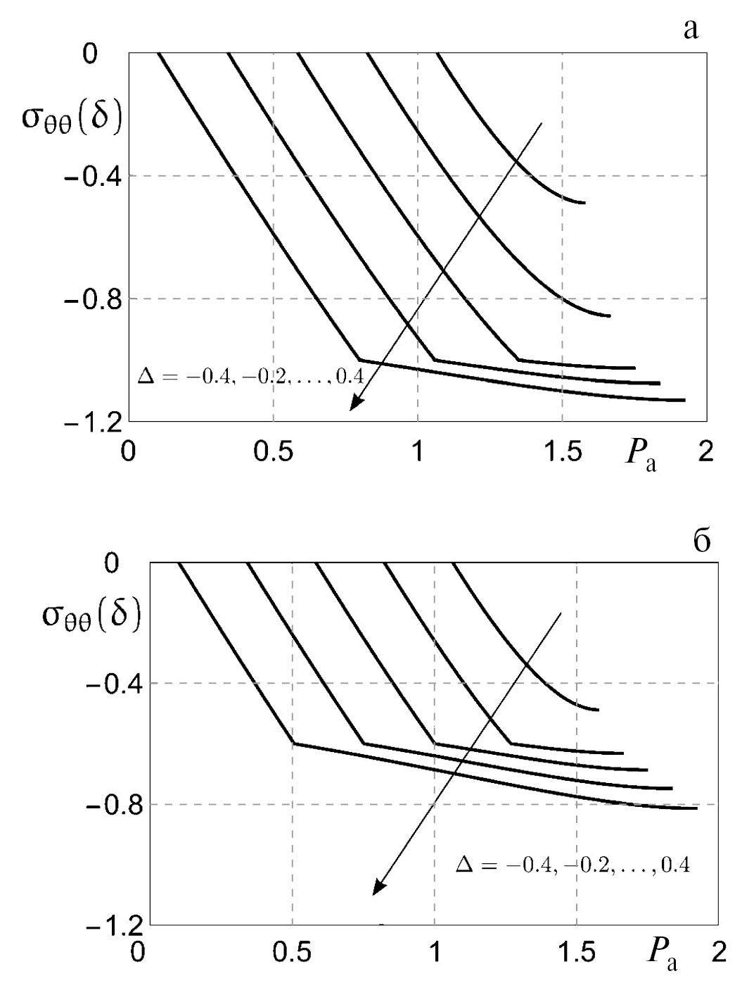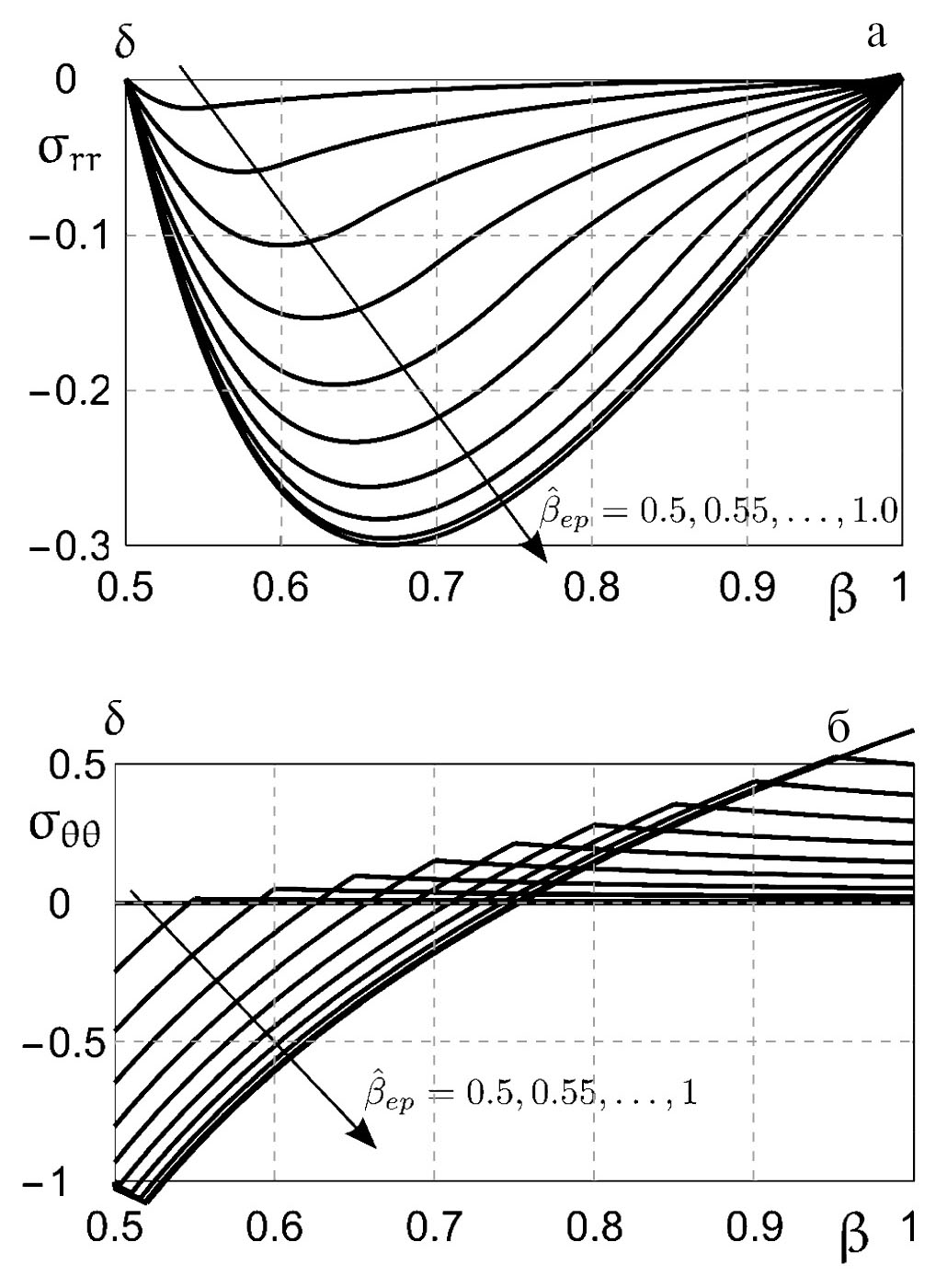 Зависимости предельного давления , соответствующего началу течения (3.7), и давления , при котором вся сфера переходит в пластическое состояние (4.9), от градиента температуры изображены на рис. 1. Интересно отметить, что увеличение температурного градиента в сфере приводит к значительному увеличению диапазона возможных значений технологического давления . В то же время при отрицательных и высоких по модулю значениях градиента сфера относительно быстро переходит в пластическое состояние. Следовательно, чем выше температурный градиент, тем более высокие значения пластических деформаций в окрестности внутренней поверхности могут быть достигнуты в ходе нагрузки, и тем выше абсолютная величина остаточных сжимающих напряжений после разгрузки. Однако данное заключение в полной мере справедливо только для чисто упругой разгрузки. На рис. 1 также представлены зависимости давления от градиента температуры для нескольких значений параметра . Видно, что эффект Баушингера существенно ограничивает область параметров , при которых разгрузка является чисто упругой, что в особенности характерно для положительных значений температурного градиента. При отрицательном градиенте возможно достичь упругой разгрузки даже при очень выраженном эффекте Баушингера.