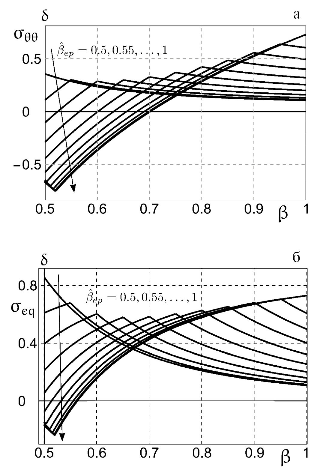 Типичные распределения тангенциального и эквивалентного эксплуатационного напряжения в сфере для различных значений координаты упругопластической границы представлены на рис. 5; градиент температуры в ходе нагрузки принят равным нулю , эффект Баушингера не рассматривается . Выбранное рабочее давление равняется . Под эквивалентным напряжением подразумевается разность . Графики для соответствуют неупрочненной сфере. Интересно отметить, что у каждого из графиков на рис. 5 есть заметный пик, соответствующий максимальному значению напряжения. В свою очередь, зависимость максимального рабочего напряжения (как тангенциального, так и эквивалентного) от координаты упругопластической границы имеет ярко выраженный U-образный вид. Низкие значения несущественно снижают напряжения в ходе эксплуатации, а высокие приводят к значительному росту растягивающих напряжений на внешней поверхности сферы. Из рис. 5 видно, что процесс автофретирования может быть оптимизирован с целью минимизации тангенциального или эквивалентного рабочего напряжения в сфере. При этом соответствующие оптимальные значения различны.