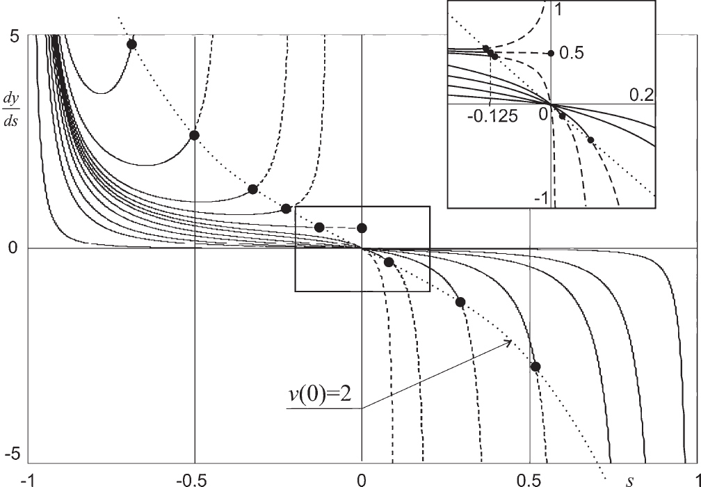 Очевидно, что каждая траектория имеет две асимптоты, одна – “в прошлом”, слева – выше траекторий, вторая – в будущем, вертикальная справа. В [3] основное внимание уделялось именно обоснованию существования этой правой асимптоты. Самая правая из них имеет координату , и ей соответствует . Все левые асимптоты – прямые, по которым двигалась бы материальная точка при отсутствии тяжести. Они пересекают ось y, на этой оси полужирными точками выделен тот ее участок, который пересекается асимптотами построенных траекторий.