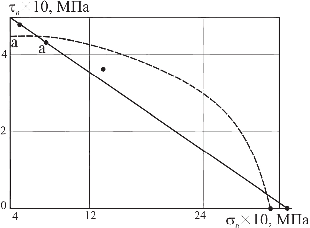 - Критерии прочности типа Кулона – Мора. Ю.Н. Работнов предложил [17–19] формулировать критерии прочности, учитывающие направленный характер разрушения волокнистых композитов, в виде предельного соотношения между нормальным и касательным напряжениями на площадке возможного разрушения, содержащей направление одного из семейств волокон: