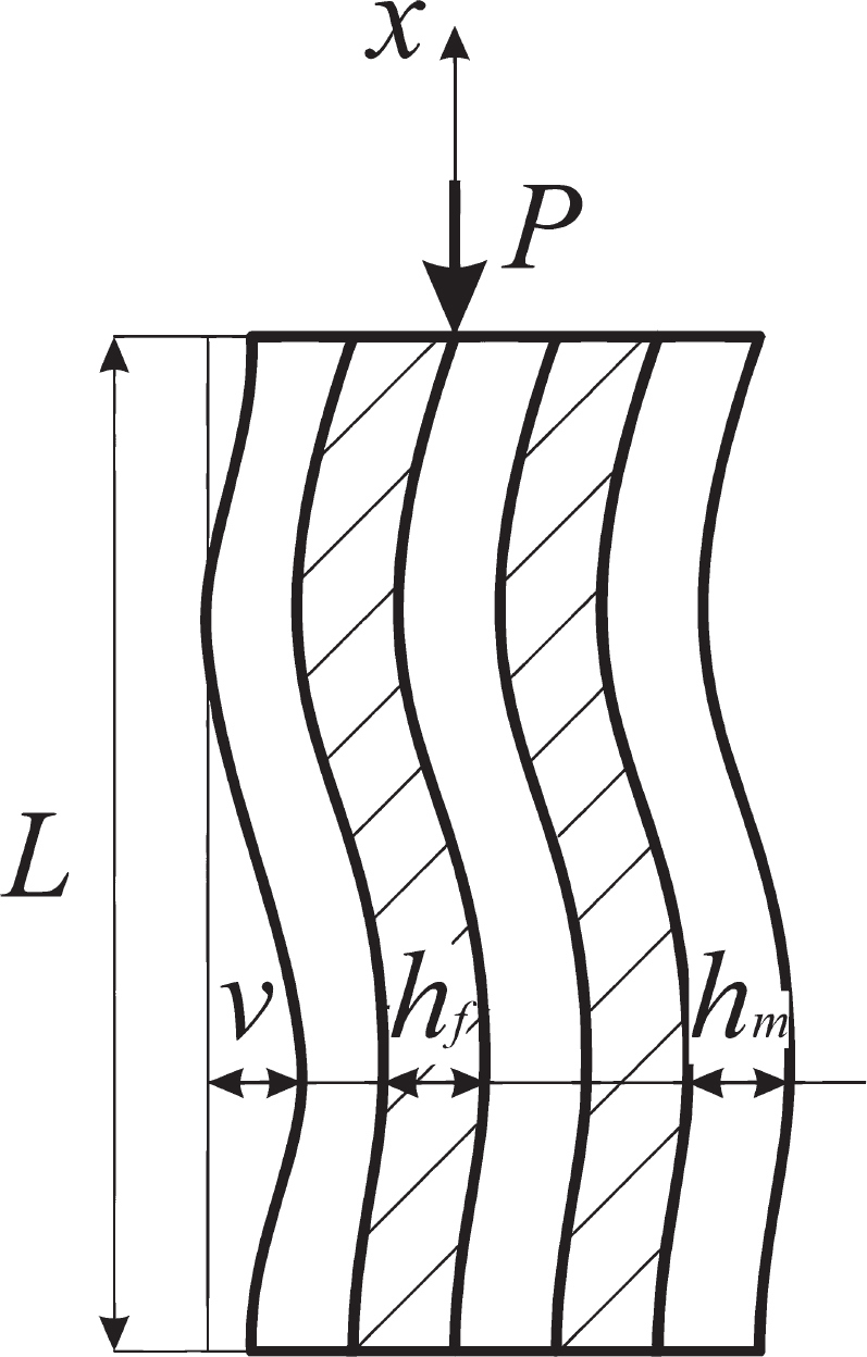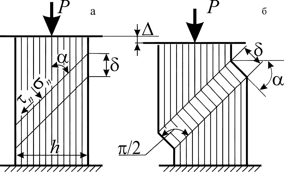 Простая модель образования кинка при сжатии композитов (или древесины), проиллюстрированная на рис. 6, основана на следующих допущениях.