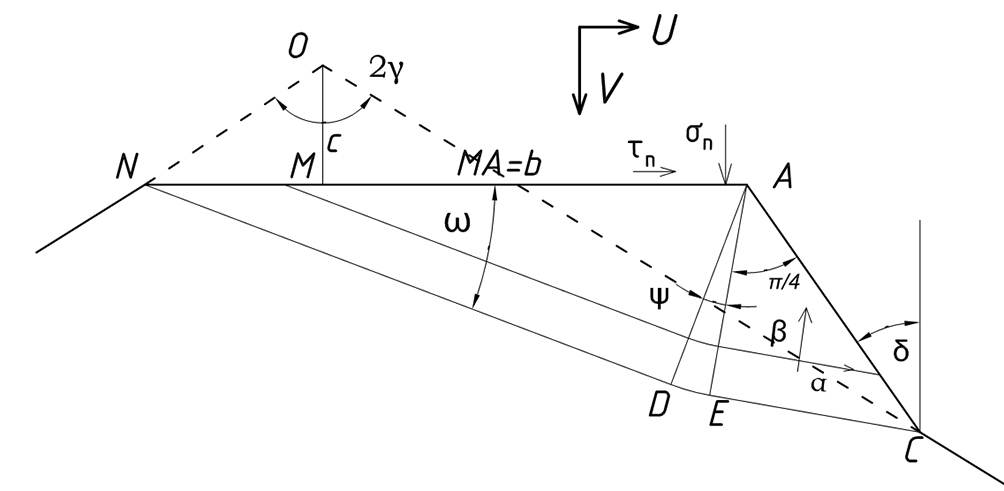 Рис. 4. Схема линий скольжения при активном сдвигающем усилии.