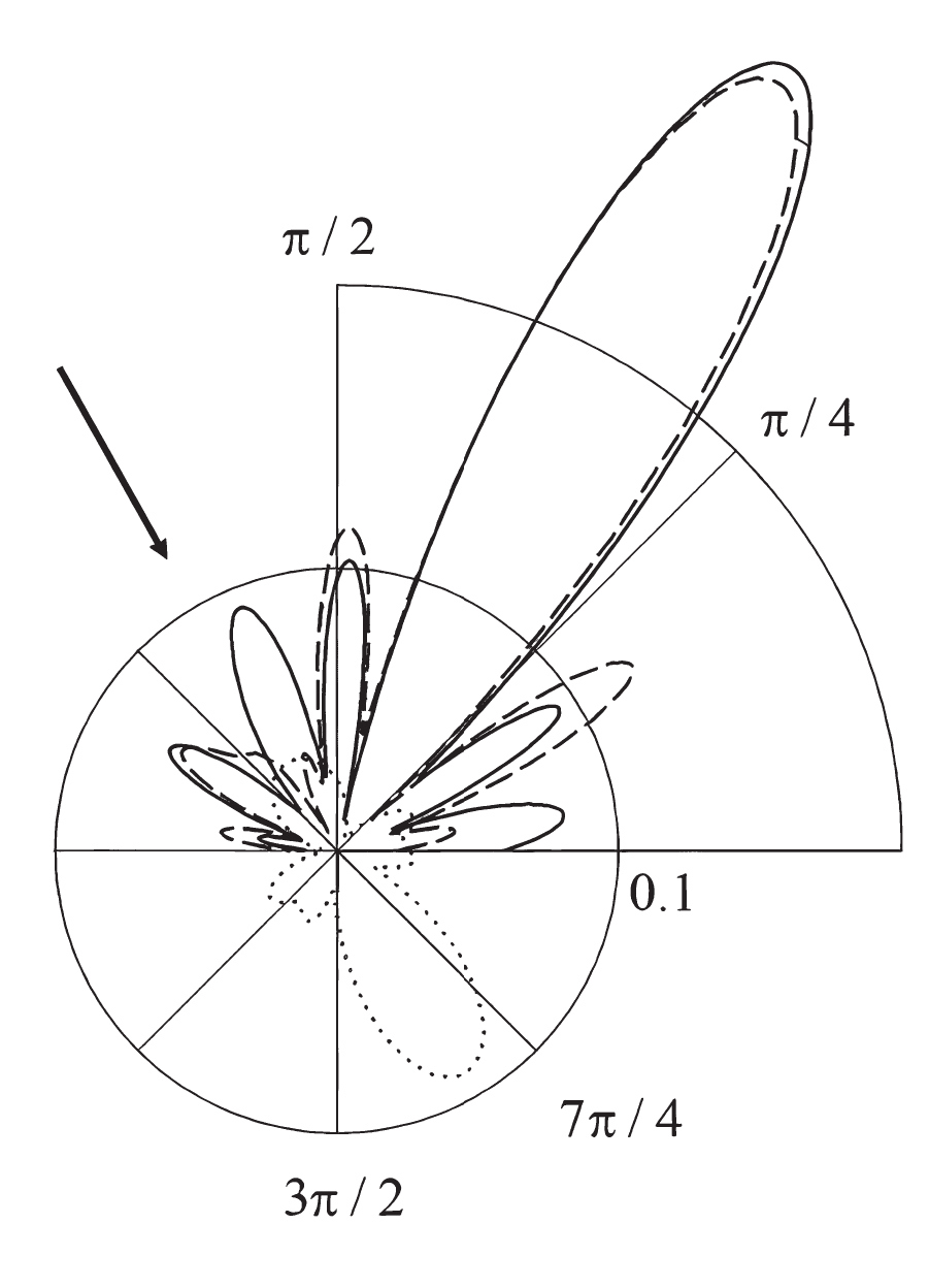 На рис. 2 представлены диаграммы направленности амплитуды рассеянного акустического поля в случае неоднородной цилиндрической оболочки для значений , . На лучах диаграмм отложены значения безразмерной амплитуды рассеяния, вычисленной для соответствующих значений угла , а стрелкой показано направление распространения падающей плоской волны. Сплошная линия соответствует случаю абсолютно жесткой поверхности, штриховая – акустически мягкой, пунктирная – оболочке, расположенной в свободном пространстве.