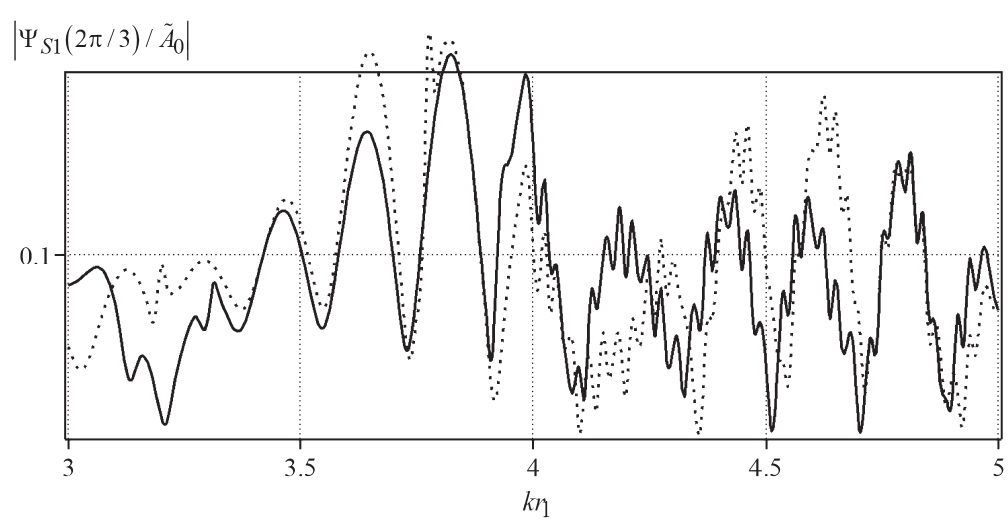 На рис. 3, 4 представлены частотные зависимости коэффициента обратного рассеяния звука от волнового размера тела в интервале для значений . Поверхность полагалась абсолютно жесткой. Пунктирные линии соответствуют однородной цилиндрической оболочке, сплошные линии – неоднородной оболочке.