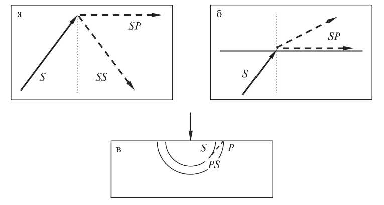 Рис. 1. a) Тип (I): отраженная SP-волна в полупространстве при критическом угле падения; б) Тип (II): преломленная SP-волна в верхнем полупространстве при критическом падении S-волны; в) Тип (III): “негеометрическая” PS-волна, возникающая при решении внешней задачи Лэмба; сплошные линии соответствуют падающим волнам; пунктирные линии соответствуют отраженным или преломленным волнам