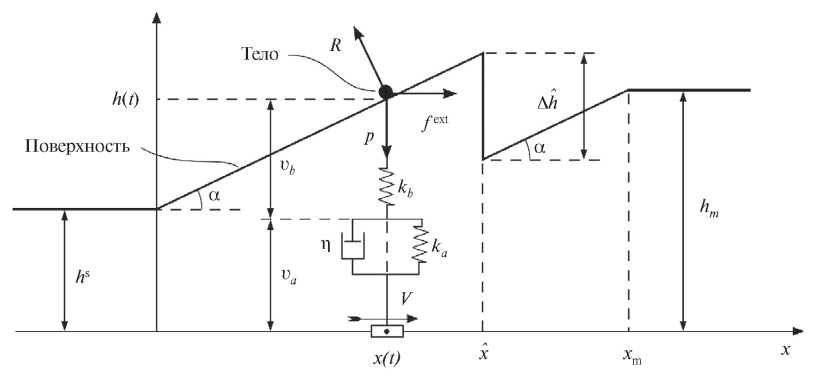 Приложение 2. Модельная система со скачком состояния. Рассмотрим систему, состоящую из материальной точки (тела), связанной через вязкоупругий элемент Кельвина с направляющей (ось x) (рис. 4). Под действием внешней силы тело скользит без трения по поверхности, образованной прямолинейными участками, два из которых разделены ступенькой и имеют положительный угол наклона к оси x. Тело движется вдоль оси x с постоянной скоростью V, при этом связь тела с направляющей через элемент Кельвина обеспечивает его прижатие к поверхности. Отметим, что в рассматриваемом примере используются обозначения, показанные на рис. 4, которые могут отличаться от обозначений основного материала статьи. Целью дальнейших выкладок является вывод баланса энергии типа (3.15) для рассматриваемой системы.