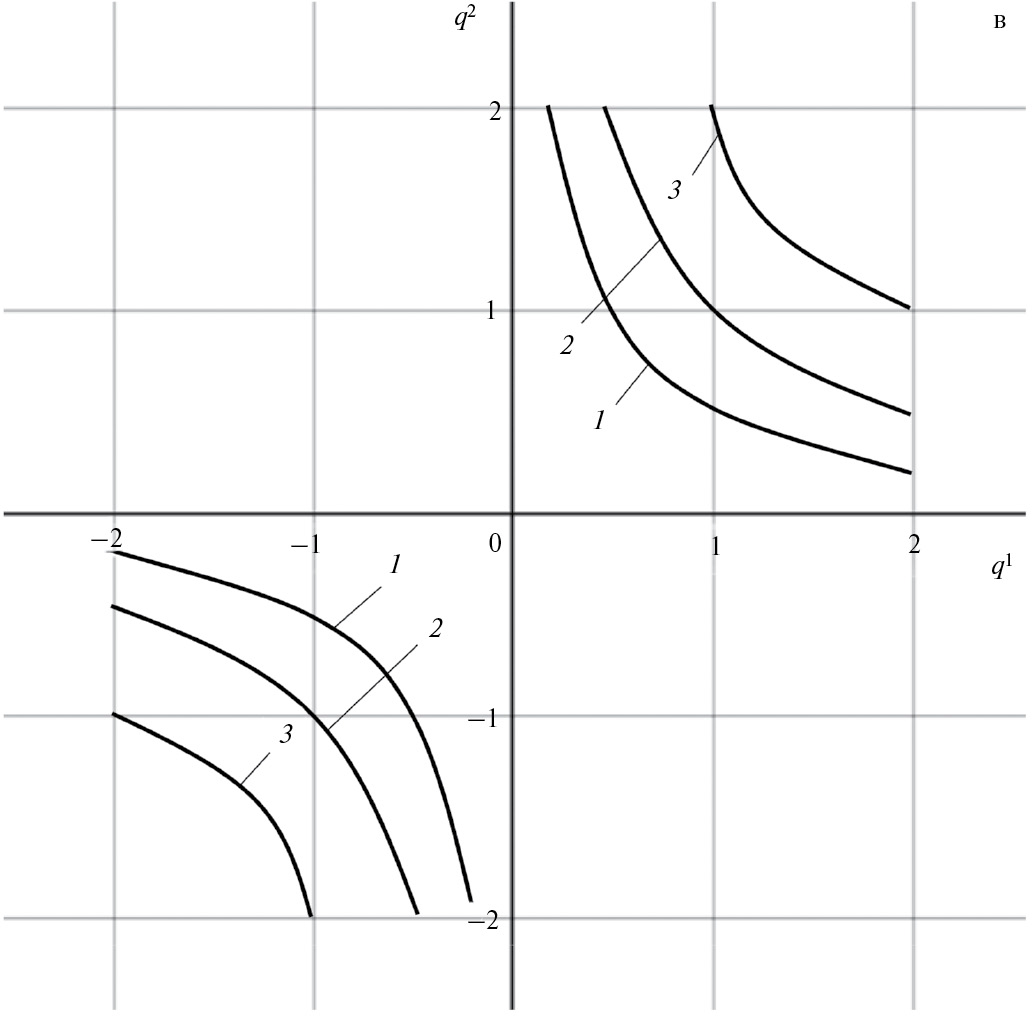 На рис. 2 для всех трех примеров для наглядности представлены графики зависимостей уравнений голономных связей для рассматриваемых случаев. Размерности параметров, при которых построены графики согласуются с размерностями обобщенных координат и .