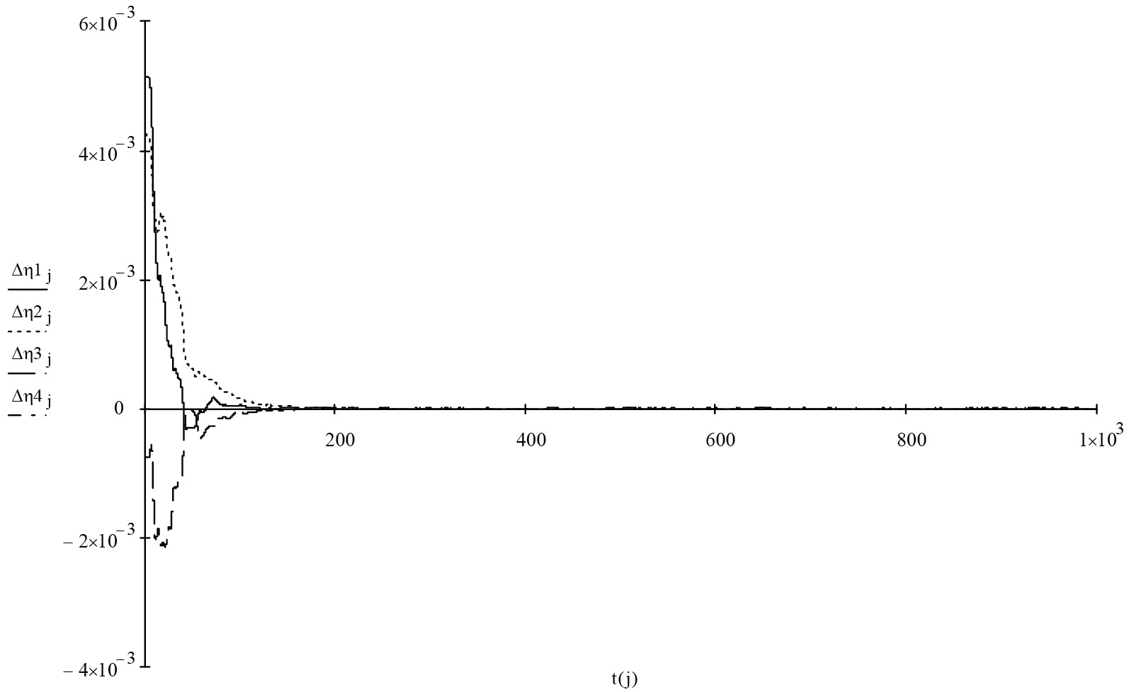 На рис. 3 приведены погрешности оценивания ориентации ПСК2 относительно ОСК, выраженные вектором параметров РодригаГамильтона η. Как видно из рис. 3, погрешности оценки компонентов вектора η после 200-й секунды не превышают 2.5·10-5 , что в углах Эйлера определяет ошибку оценивания в интервалах: для курсового угла: 2.1·10-5 2.6·10-5 рад, для угла тангажа: 2.2·10-5 2.4·10-5 рад, для угла крена: 2.3·10-5 2.4·10-5 рад.