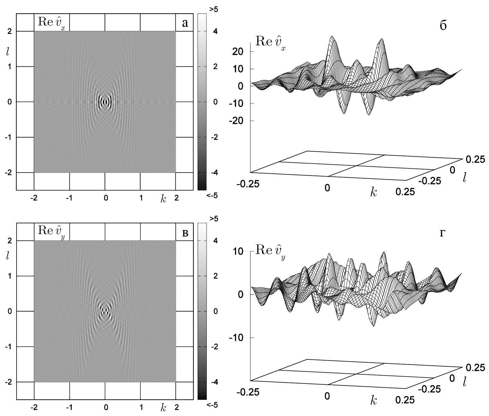 Рис. 8. Вещественные составляющие Фурье-образов компонент скорости течения на поверхности жидкости: