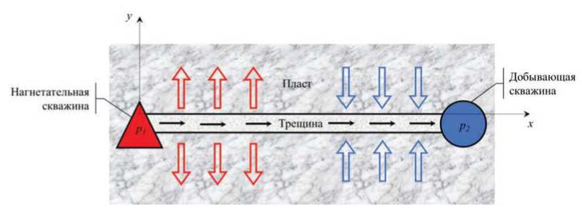 - Введение. На добывающих скважинах для повышения нефтеотдачи низкопроницаемых нефтяных коллекторов создают технологические трещины гидроразрыва пласта (ГРП). Для того чтобы эти трещины не смыкались под действием нормальных сжимающих напряжений они закрепляются твердым гранулированным материалом – проппантом. С другой стороны, на нагнетательных скважинах, вводимых для поддержания высокого пластового давления в истощенных коллекторах, из-за высоких давлений нагнетания жидкости образуются разрывы породы – техногенные трещины авто-ГРП. Часто трещины авто-ГРП достигают добывающих скважин. Со временем эти разрывы породы промываются нагнетаемыми фильтрационными потоками и вследствие эрозии трансформируются в незакрепленные проппантом трещины с некоторым характерным раскрытием. Таким образом, в коллекторе образуется система скважина–трещина–скважина–пласт, в которой возникает билинейный поток, представляющий одномерное течение в трещине авто-ГРП и перпендикулярное трещине фильтрационное течение в коллекторе с прямолинейными траекториями частиц.