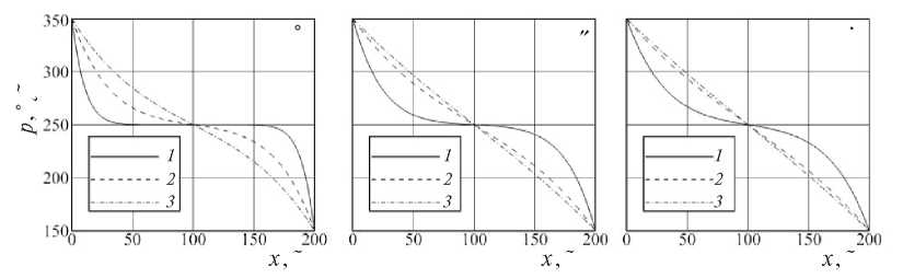Рис. 3. Изменение давления в трещине в моменты времени (а–в) – t = 1, 24 и 72 ч для различных проницаемостей пласта k. Ширина трещины равна w = 10–4 м: 1–3 – k = 1, 10, 100 мД