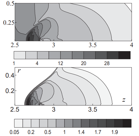 Расчеты проникновения неоднородного облака в слой проводились с использованием разностных схем второго порядка аппроксимации типа Лакса–Вендроффа и Лакса–Фридрихса. Выбирались цилиндрическая система координат (z,r) и равномерная прямоугольная сетка с одинаковым по координатам шагом. Расчеты выполнялись в области (0 ≤ z ≤6; 0 ≤ r ≤3). Шаг сетки составлял 5·10–3, так что разрешение было примерно таким же, как в работе [17].