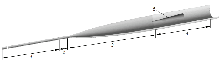 1 – камера высокого давления, 2 – форкамера, 3 – сопло, 4 – рабочая часть, 5 – конус