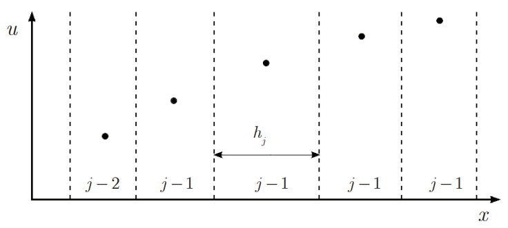 Для построения расчетной схемы используется система координат, связанная с сеточными линиями. Предполагается, что имеется ненулевой определитель матрицы Якоби J. Переход между декартовой и сеточной системами координат осуществляется по формуле: . После перехода все действия производятся вдоль сеточных линий по одномерным соотношениям. На рис. 3 приведен пример пятиточечного сеточного шаблона. Границы ячеек изображены пунктирными линиями. Значения функций в центрах ячеек – кружками. Центрам ячеек приписываются целочисленные индексы, граням (пунктиры) – половинные.