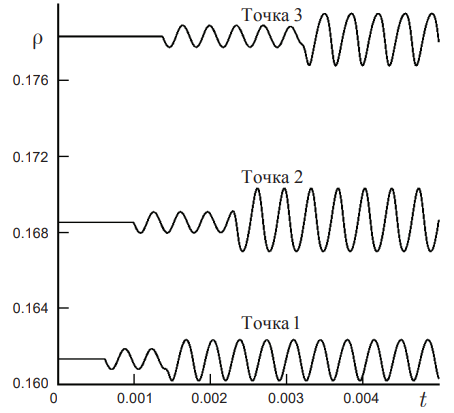 На рис. 10 приведены графики поведения плотности во времени для всех трех точек. Решение получено на сетке 288×72×1 ячеек в постановке (WENO5, SSP54). Наличие отраженного скачка уплотнения качественно не повлияло на результат. Следует отметить, что плотность газа увеличивается за скачками уплотнения. Кроме того, наблюдается заметный сдвиг фазы из за движения волн.