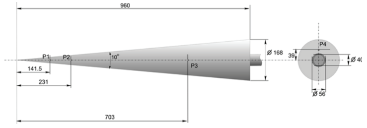 Площадь дна конуса составляла 0.022 м2, а технологический радиус носика – 0.08 мм. Конус устанавливался на шестикомпонентных внутримодельных тензометрических весах. Весы закреплялись в хвостовой державке, которая, в свою очередь, крепилась к вертикальной стойке. На поверхности модели имелись четыре приемных отверстия для измерения статического давления. Диапазоном измерения составлял ±35 кПа. Схема расположения приемных отверстий приведена на рис. 14. Три отверстия (Р1 – Р3) расположены на боковой поверхности конуса и одно (Р4) – на донной поверхности.