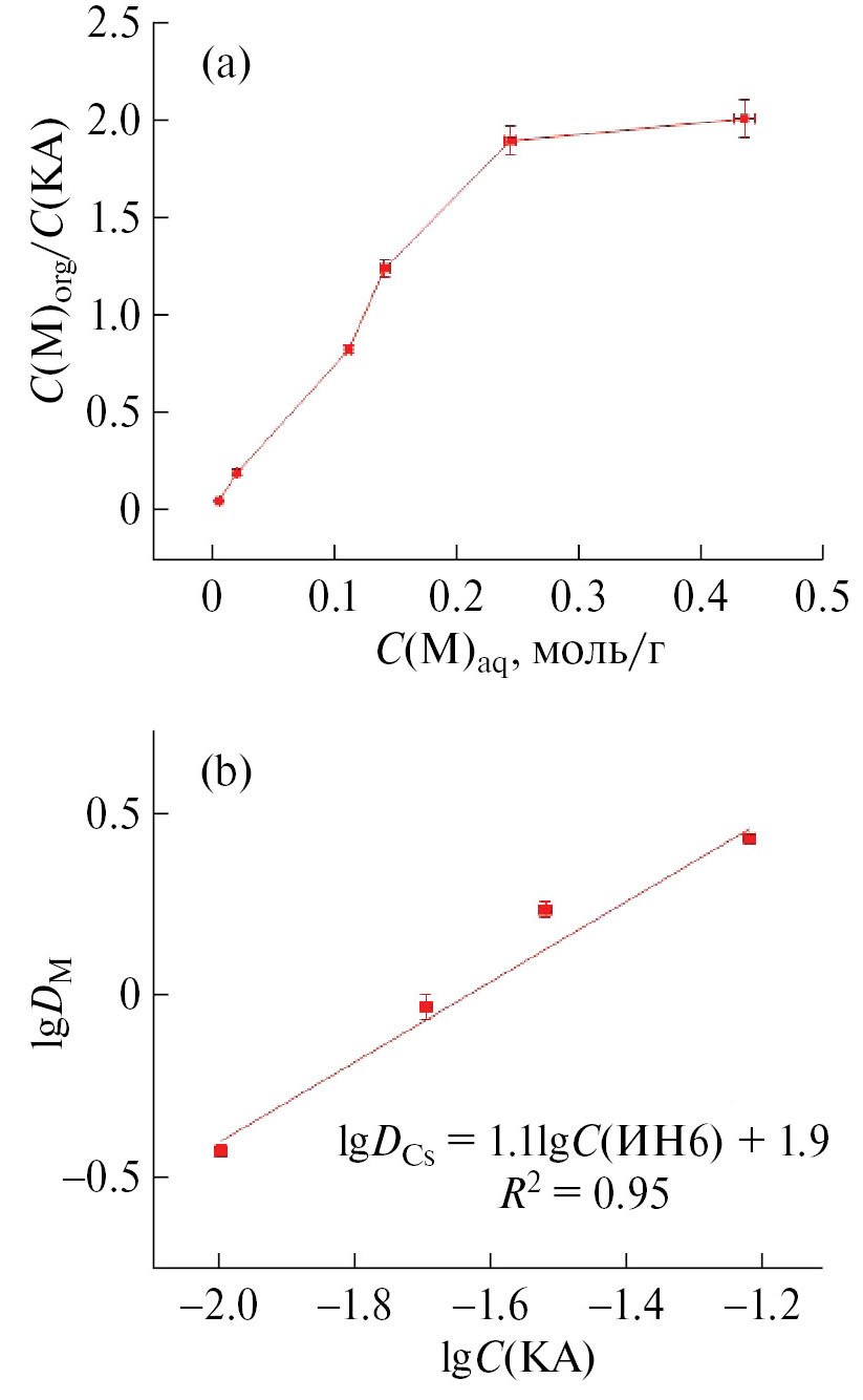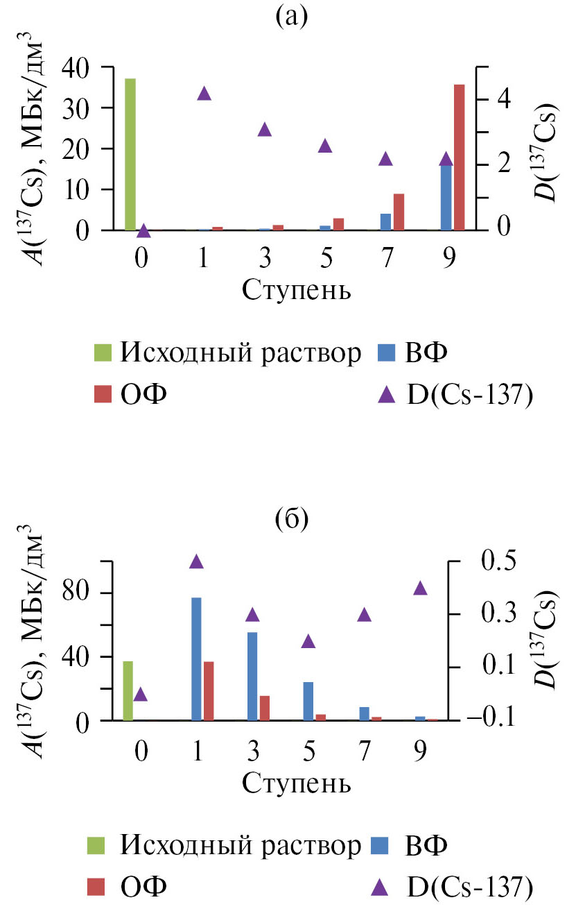 Статические эксперименты по экстракции проводили при перемешивании органической и водной фаз при температуре 20–22°С в течение 15 мин при соотношении объемов О : В, равном 1 : 1. Активность 137Cs в пробах равновесных органических и водных фаз определяли γ-спектрометрически. Содержание стабильных металлов в равновесной водной и органической фазах определяли методом ICP-OES. Из органической фазы предварительно проводили реэкстракцию металлов раствором 1 моль/дм3 HNO3.