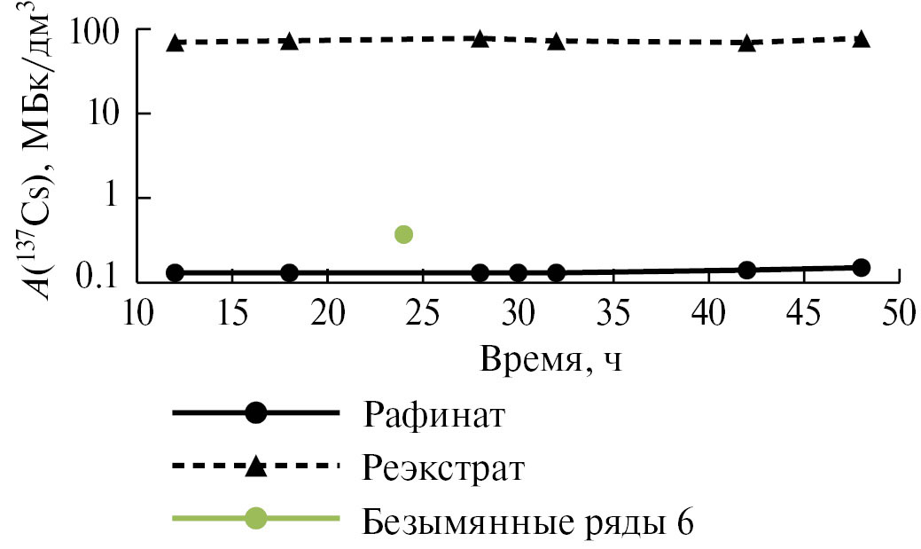 По мере насыщения экстрагента коэффициенты распределения 137Cs в блоке экстракции ожидаемо снижаются. Теоретически при данных коэффициентах распределения извлечение 137Cs на восьми ступенях экстракции должно быть не менее 99.9%. На фоне стабильного микроэмульсионного уноса цезия с блока реэкстракции в блок экстракции и последующего разрушения микроэмульсии в первой ступени блока экстракции можно сделать предположение, что микроэмульсия является источником проскока 137Cs в рафинат блока экстракции. Учитывая стабильный проскок 0.14 МБк/дм3 137Cs в рафинат и объемную активность 0.71 МБк/дм3 оборотной экстракционной смеси, коэффициент распределения 137Cs составит 4.1, что совпадает с данными (4.2) для первой ступени блока экстракции, из которой выходит рафинат.