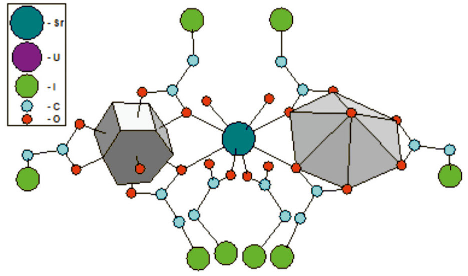 Синтез. В водный раствор моноиодуксусной кислоты (0.558 г (3 ммоль) в 10 мл воды) вносили навеску оксида урана(VI) (0.143 г, 0.5 ммоль) и перемешивали до полного растворения. Затем приливали 10 мл водного раствора гексагидрата хлорида стронция (1.335 г, 5 ммоль). Полученный ярко-желтый раствор (pH 2) оставляли для медленной кристаллизации на воздухе при комнатной температуре. Через 6–7 сут выделялись желтые кристаллы состава I.
