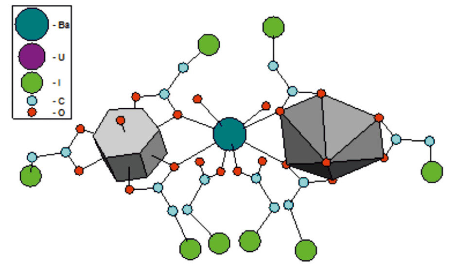 Рис. 2. Строение трехъядерного кластера {Ba[UO2(mia)3]2 (Hmia)2(H2O)2}. Для упрощения рисунка атомы Н не указаны. Для правого атома U(VI) в кластере показан КП (гексагональная бипирамида), а для левого – соответствующий ПВД (гексагональная призма).