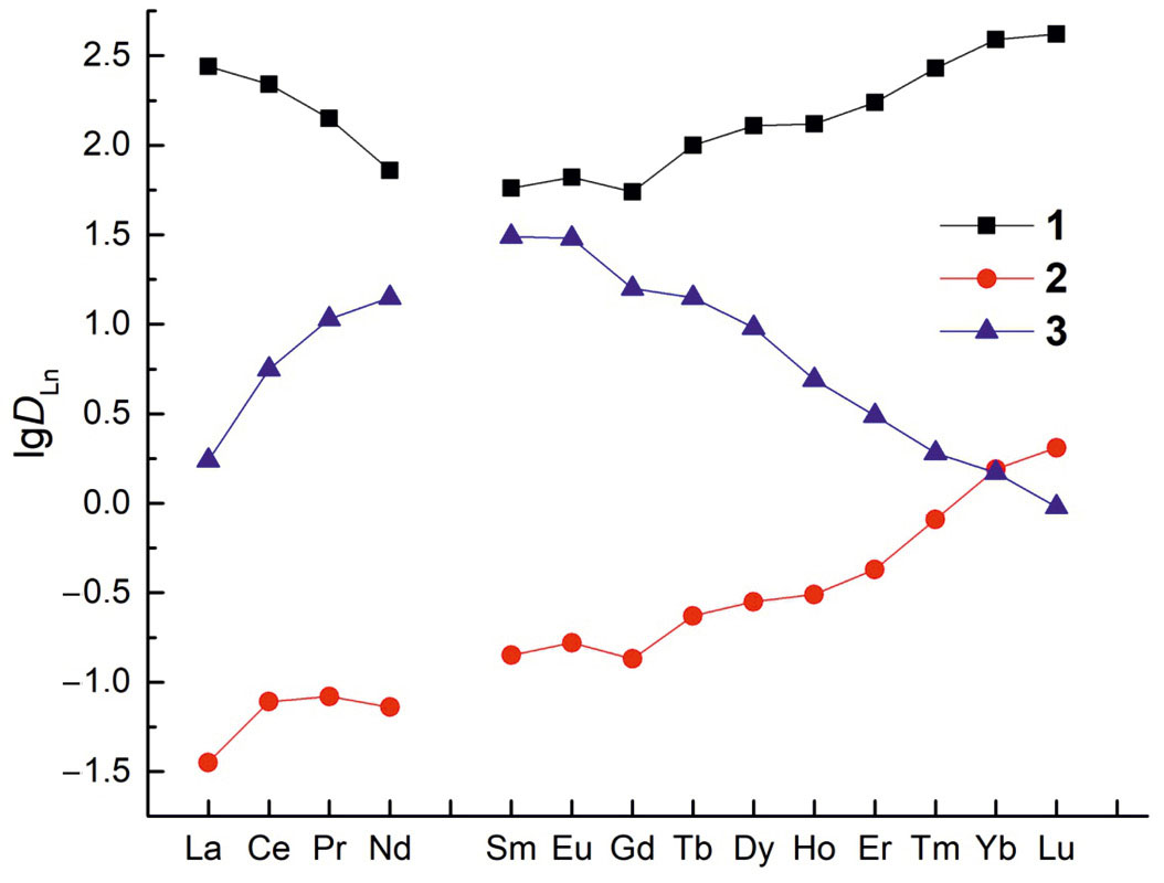 Стехиометрическое соотношение Ln(III) : экстрагент в экстрагируемых комплексах определено методом сдвига равновесия. Угловой наклон зависимостей DLn–lg[L] равен 1.47 ± 0.05 и 1.98 ± 0.05 при экстракции ионов Ln(III) соединениями 1 и 3 соответственно (рис. 1S), что указывает на экстракцию ионов Ln(III) из азотнокислых растворов соединением 1 в дихлорэтане в виде смеси моно- и дисольватов, а соединением 3 – в форме дисольватов. Ранее было установлено, что в виде дисольватов ионы Ln(III) экстрагируются растворами соединения 2 в дихлорэтане [12].