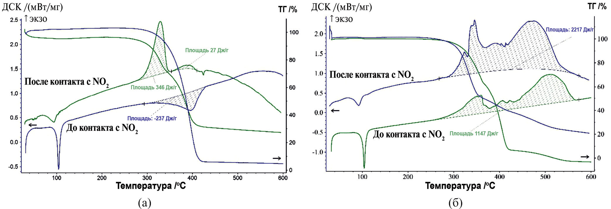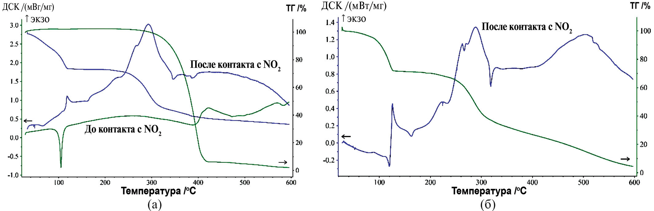 Нагрев образца ДБ21К7 после контакта с NO2 в инертной атмосфере сопровождается последовательным двухстадийным экзотермическим процессом в области температур 260–420°С. Величина общего теплового эффекта составляет порядка 370 ± 20 Дж/г. Данные экзотермические процессы предположительно связаны с образующимися продуктами деструкции краун-эфира после контакта с NO2, поскольку в исходном ДБ21К7 видимых эффектов в инертной атмосфере с выделением тепла не наблюдается.