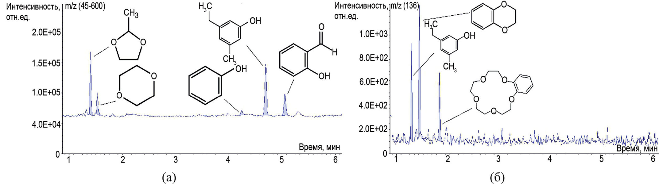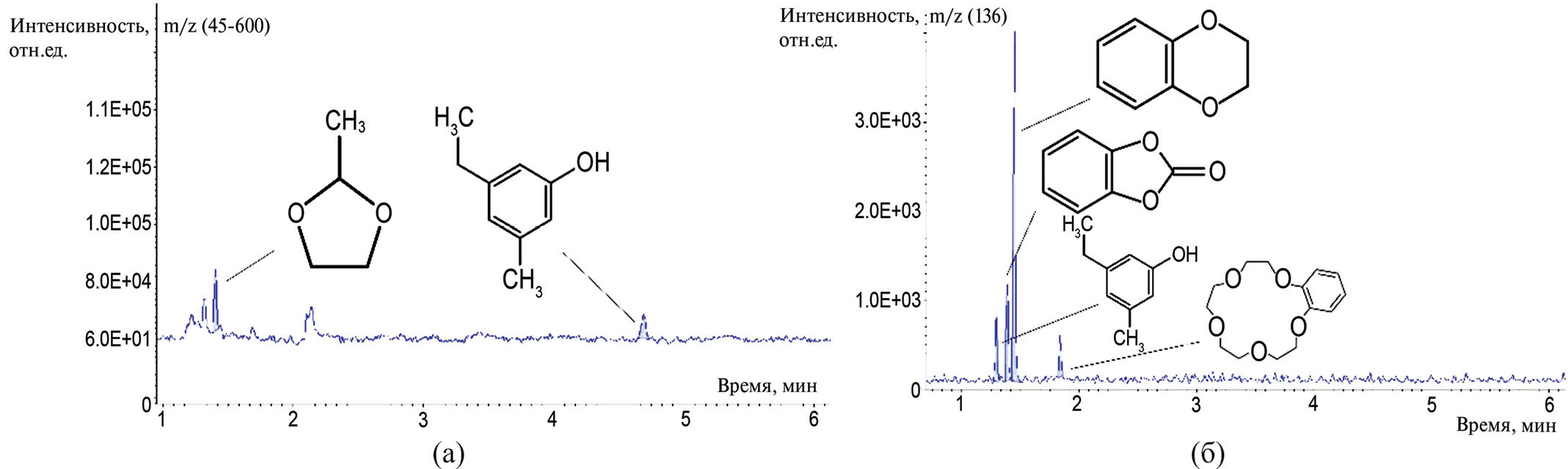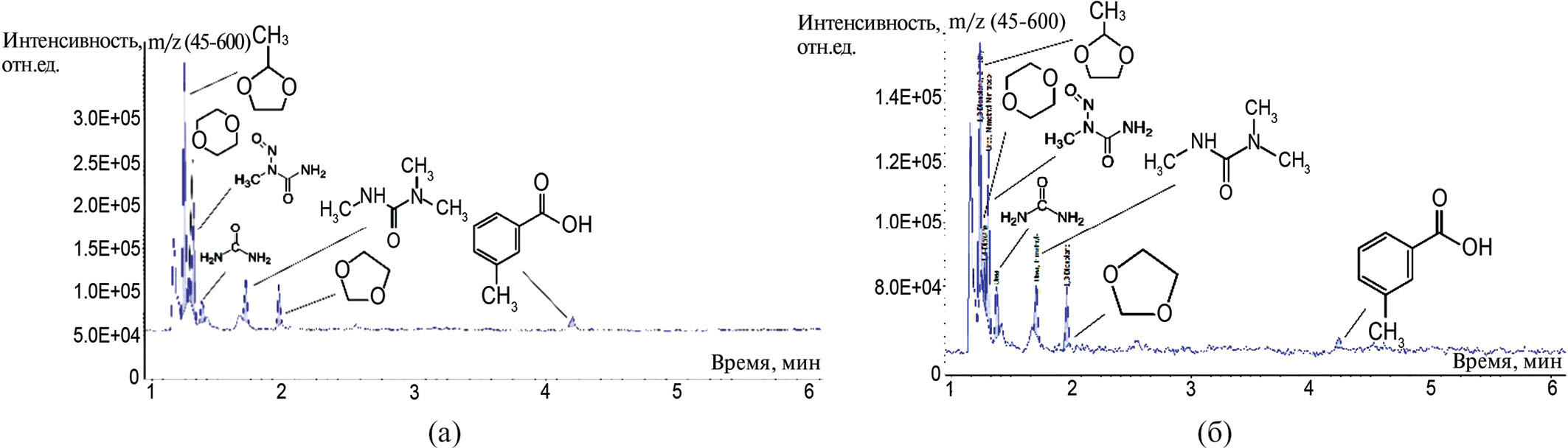 Рис. 8. Хроматограмма летучих соединений разложения образца 3 при температуре 300°С в атмосферах (температура хроматографической колонки 120°С): а – инертной, б – окислительной.
