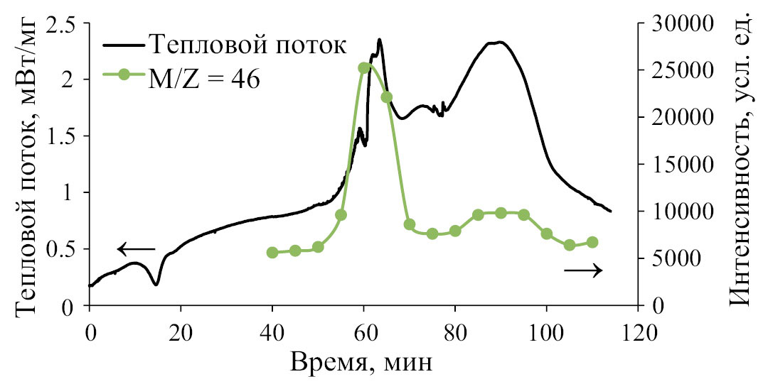 Как видно из рис. 9, интенсивность выделения оксидов азота (m/z = 46) возрастает в момент времени 20 и 50 мин, что соответствует испарению ДХЭ в области температур 100–120°С и протеканию основного процесса тепловыделения. Предположительно при контакте диоксида азота с раствором ДБ21К7 в ДХЭ образуются промежуточные неустойчивые нитросоединения, которые при нагреве в окислительной атмосфере разлагаются до оксидов азота [19]. Либо диоксид азота растворяется в ДХЭ и выделяется одновременно с его испарением. После завершения испарения ДХЭ в диапазоне температур 120–150°С наблюдается экзотермический эффект, который, вероятно, связан с разложением или окислением продуктов, образующихся при взаимодействии ДБ21К7 в ДХЭ с диоксидом азота, о чем свидетельствует второй максимум пика m/z = 46 на 50-й минуте.