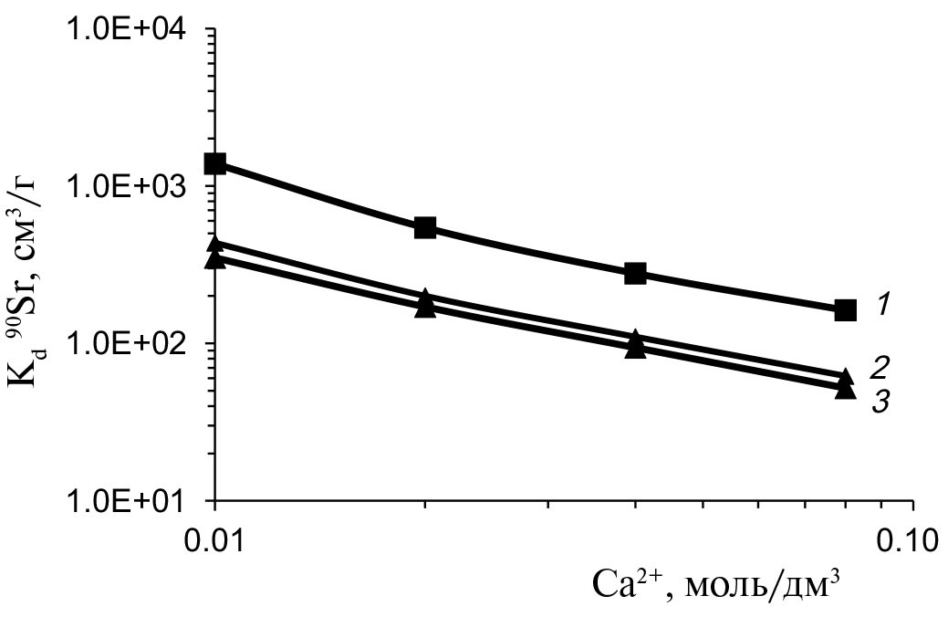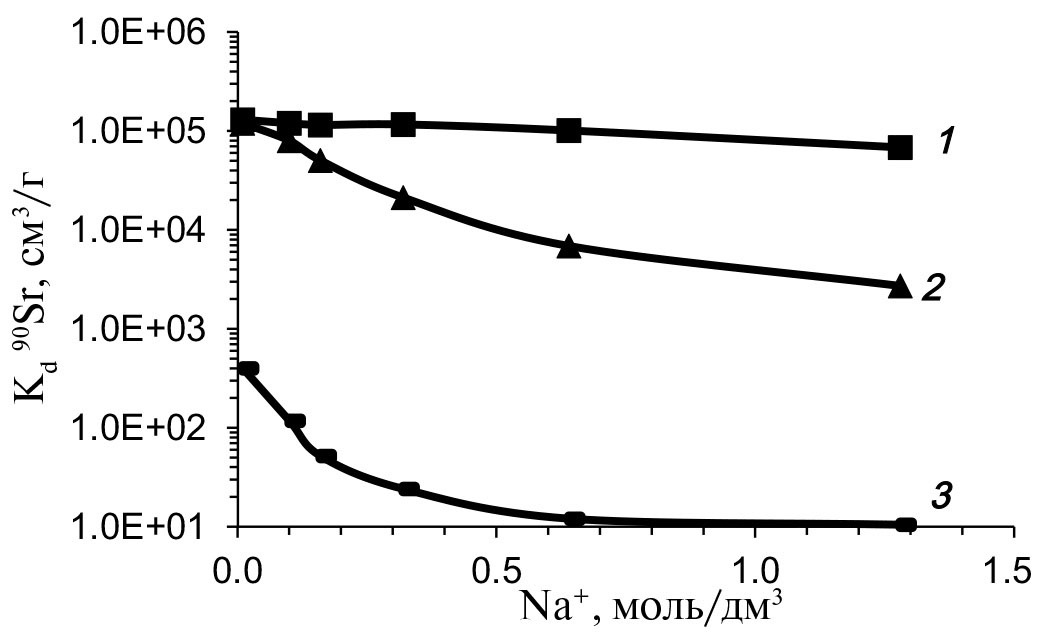 Зависимость Kd 90Sr от концентрации ионов натрия и кальция снимали в аналогичных условиях в растворах 0.1–1.3 моль/дм3 NaNO3 и 0.01–0.08 моль/дм3 CaCl2 соответственно.