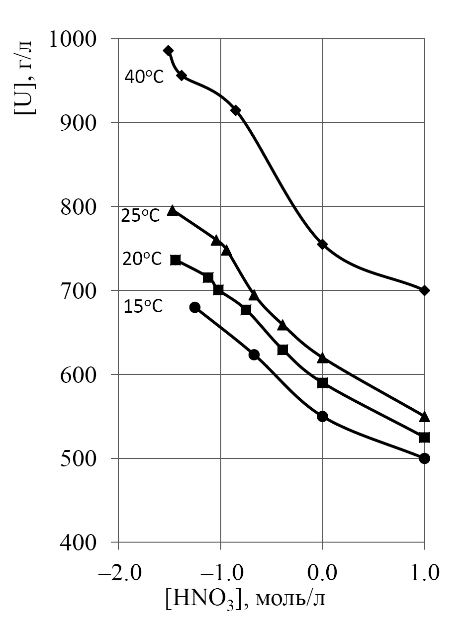 – в азотнокислых растворах с дефицитом HNO3 растворимость урана выше, чем в растворах с остаточной [HNO3] > 0 моль/л. Растворы с [U] 600 г/л и [HNO3] –(0.5–1.0) моль/л устойчивы (не кристаллизуются) при снижении температуры до 15°С;