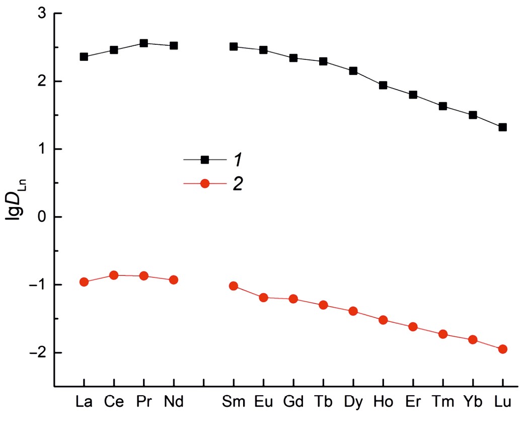 Содержание Ln(III), U(VI) и Th(IV) в исходных и равновесных водных растворах определяли методом масс-спектрометрии с ионизацией пробы в индуктивно связанной плазме с использованием масс-спектрометра XSeries 2 (Thermo Scientific, США). Содержание элементов в органической фазе определяли по разнице концентраций в водном растворе до и после экстракции. Коэффициенты распределения элементов (D) рассчитывали как отношение их концентраций в равновесных фазах. Погрешность определения D не превышала 10%.
