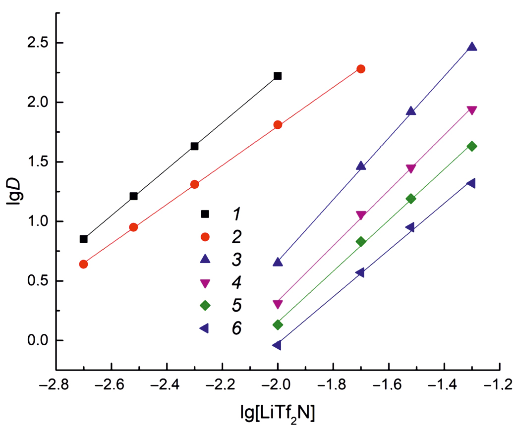 Исследование влияния концентрации HNO3 в равновесной водной фазе на эффективность экстракции ионов металлов растворами смесей Ph2Oct2 и LiTf2N показало, что значения DLn уменьшаются с ростом [HNO3] (рис. 5, табл. S2). Такой характер зависимости D–[HNO3] указывает на катионообменный механизм экстракции ионов металлов растворами смесей Ph2Oct2 и LiTf2N, как и при экстракции этих ионов растворами КМФО в ИЖ CnmimTf2N [14].