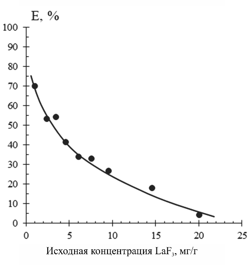 Из соотношения исходной и конечной концентраций при сорбции в динамических условиях для различных исходных концентраций фторида лантана, которая описывается линейной зависимостью в логарифмических координатах, рассчитали степени извлечения. Они представлены на рис. 4 для разных исходных концентраций фторида лантана. Из рис. 4 следует, что наиболее эффективно активный уголь извлекает фторид лантана из расплава для концентраций ниже 5 мг/г.