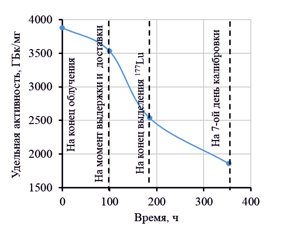 Проведена оценка изменения удельной активности 177Lu за время облучения иттербиевой мишени в реакторе и ее выдержки, за время выделения 177Lu и на 7-й день калибровки препарата 177Lu. Полученные результаты хорошо коррелируют с накоплением побочного 175Lu за счет β-распада 175Yb за 103 ч облучения в реакторе, транспортировки мишеней до места переработки за 100 ч и выделения 177Lu в течение 80 ч. Удельная активность препарата на момент выделения препарата 177Lu составила 2600 ГБк/мг Lu. Таким образом, для получения препарата с высокой удельной активностью требуется организация производства в непосредственной близости от реактора и сокращение длительности выделения 177Lu из облученной мишени.