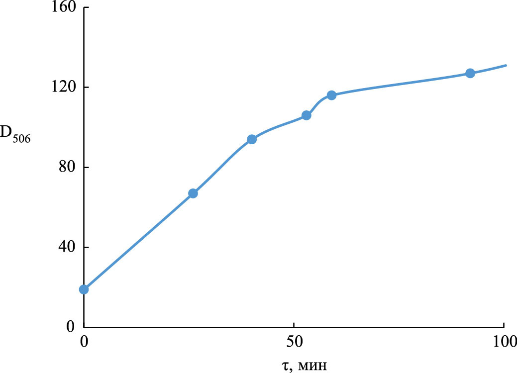 На рис.1 приведена кинетическая кривая накопления Pu(IV) в растворе, содержащем 28 ммоль/л ЭДТА, 2.87 ммоль/л Pu(V), с начальным рН 2.91 при 45°C.