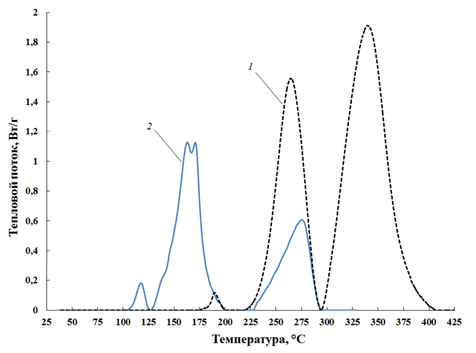 Как видно из рис. 1, термолиз как необлученного, так и облученного анионита ВП–1АП протекает в несколько стадий, сопровождающихся выделением тепла. При нагреве необлученного сорбента от 30 до 400°C первый экзотермический процесс наблюдается при температуре 175°C, что согласуется с данными работы [19]. Данный эффект обладает небольшой интенсивностью и связан, по-видимому, с окислением незначительных количеств продуктов термолиза сорбента, выделившихся при этой температуре. На второй и третьей стадиях со стартовыми температурами около 220 и 295°C происходит интенсивное окисление функциональных групп и самой матрицы ионита с удельным тепловыделением 754 и 1370 Дж/г соответственно. Реакции на второй и третьей стадиях растянуты во времени и продолжаются 20–25 мин.