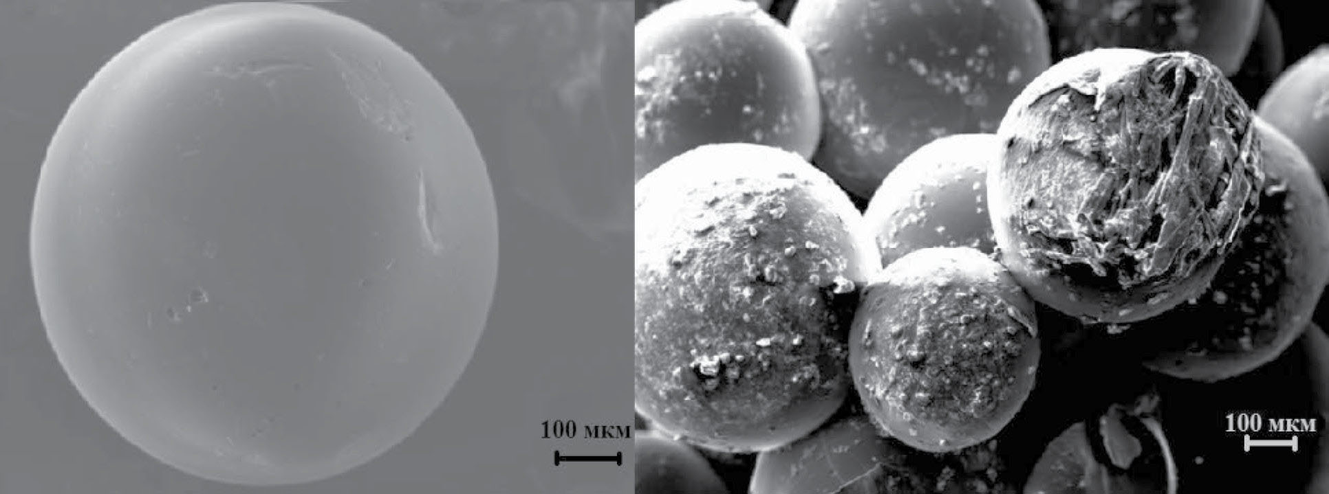 Облучение ионита приводит к изменению физико-химических характеристик сорбента. При сравнении изображений поверхности гранул анионита до и после облучения (рис. 3) видно образование дефектов поверхности, механическое разрушение гранул, увеличение размера пор, что также может сказываться на термической стабильности сорбента. Кроме этого, при облучении изменяется цвет гранул ионита со светло-желтого на оранжевый, а сами гранулы слипаются с образованием агрегатов.
