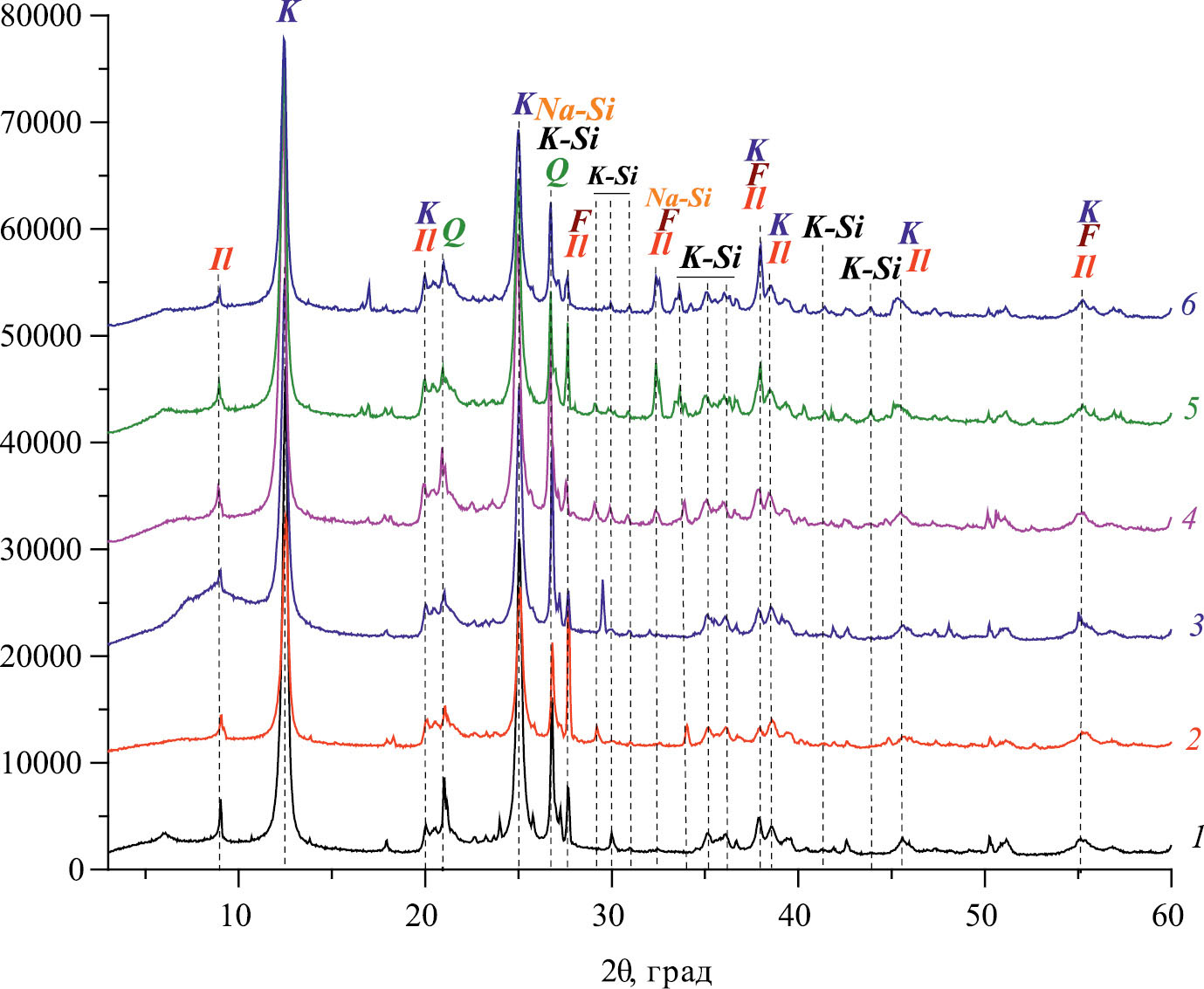 Рис. 2. Модифицированная глина КГПО-28 (1 – КГПО-28-W, 2 – КГПО-28-Carb, 3 –КГПО-28-Az, 4 – КГПО-28-W-Alk, 5 – КГПО-28-Carb-Alk, 6 – КГПО-28-Az-Alk; K – каолинит, Al2Si2O5(OH)4 [11], Q – кварц [12], F – калиевый полевой шпат, KAlSi3O8 [13], Il – иллит, KAl3Si3O10(OH)2 [14], Na-Si – силикат натрия водный, Na2SiO3⋅5H2O [21], K-Si – силикат калия, К4(H4Si4O12) [23]).